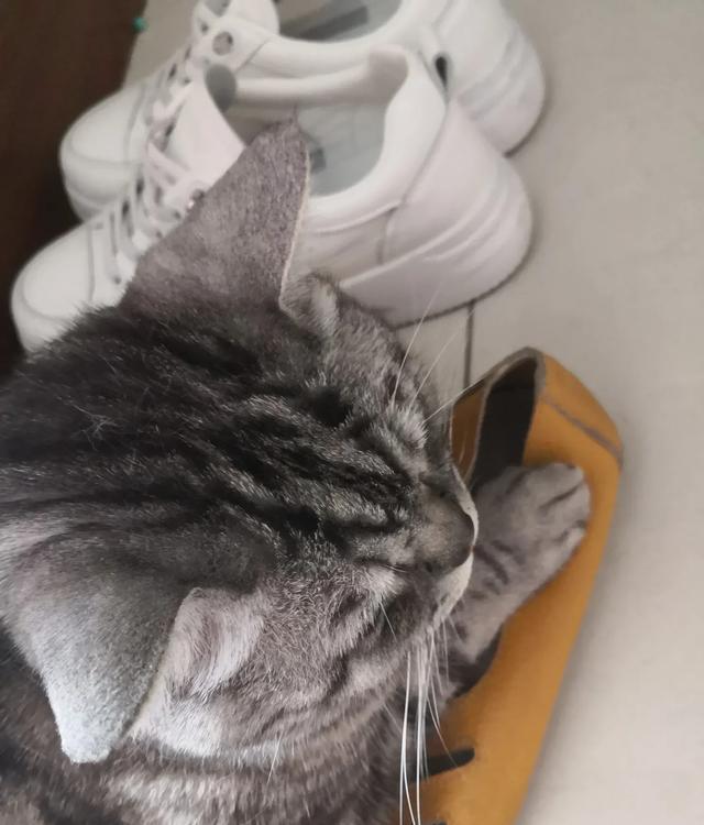 它喜新不厌旧,睡觉得换地。一会我的鞋子成了它枕着睡觉的垫,一会不知道哪件衣服、塑料布、纸箱子成了睡垫。